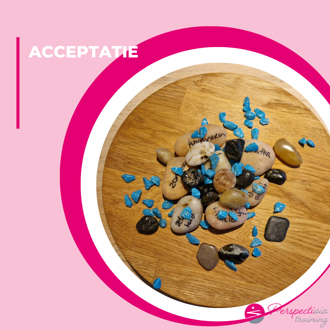 Acceptatie is: stilstaan en kijken. Het erkennen en ruimte geven aan (ongewenste) gedachten, gevoelens en sensaties zonder ze te willen veranderen, wat juist de strijd vermindert.