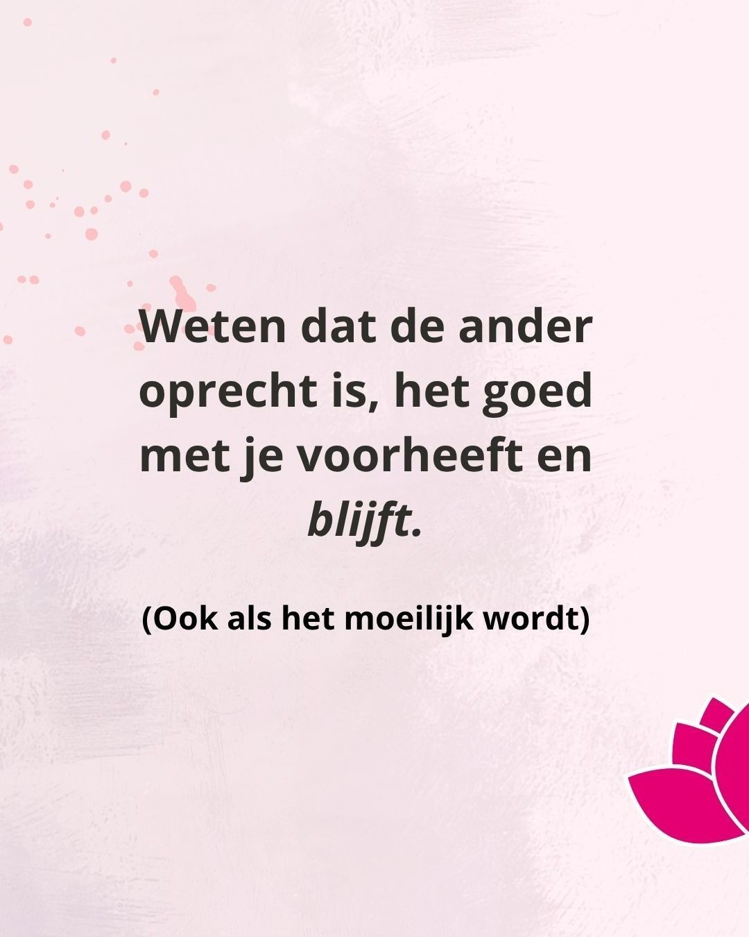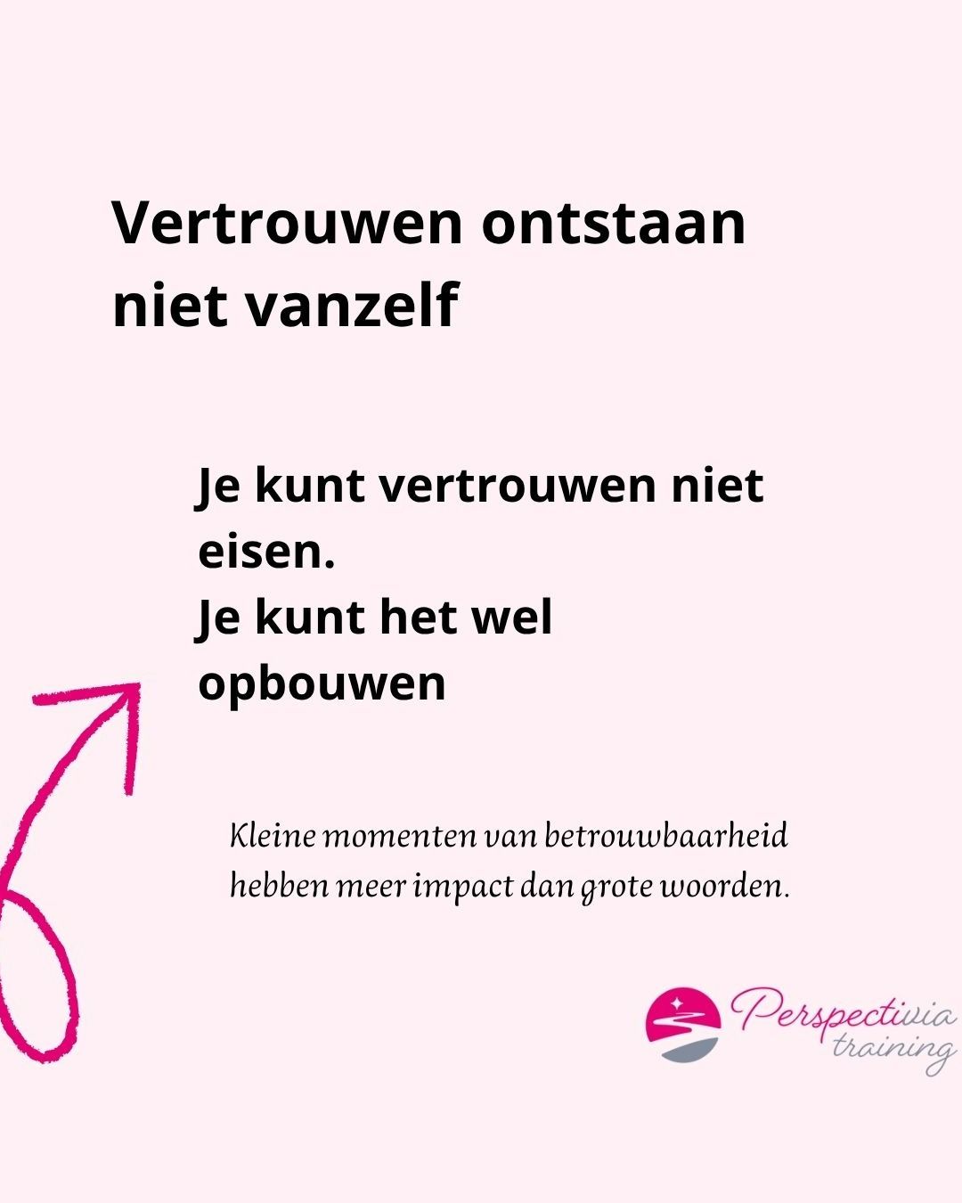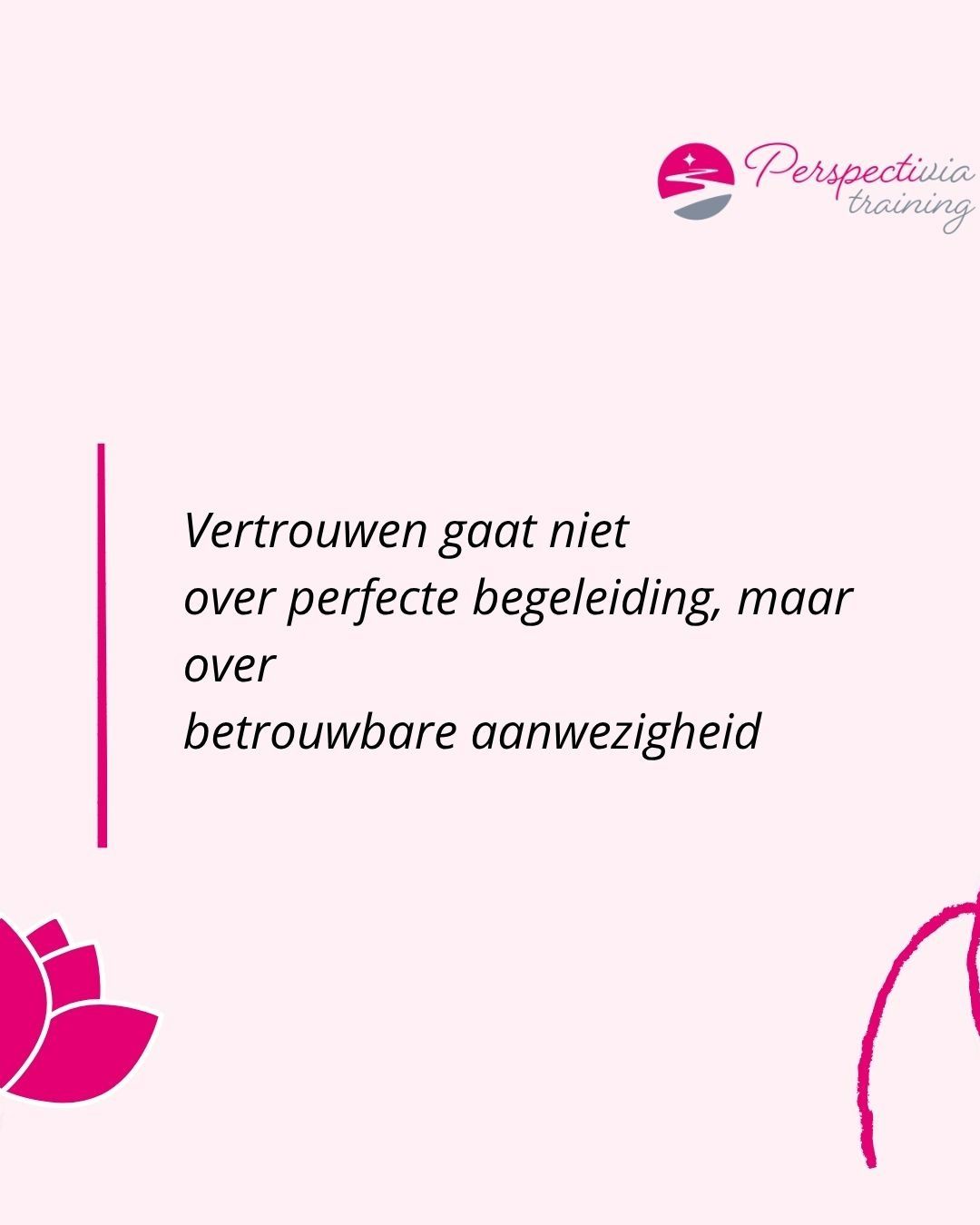 Vertrouwen groeit langzaam. Het betekent weten dat de ander het goed met je voorheeft – dat je gezien en serieus genomen wordt. Vertrouwen geef je door betrouwbaar te zijn, door te doen wat je zegt en te blijven, ook als het moeilijk wordt.
